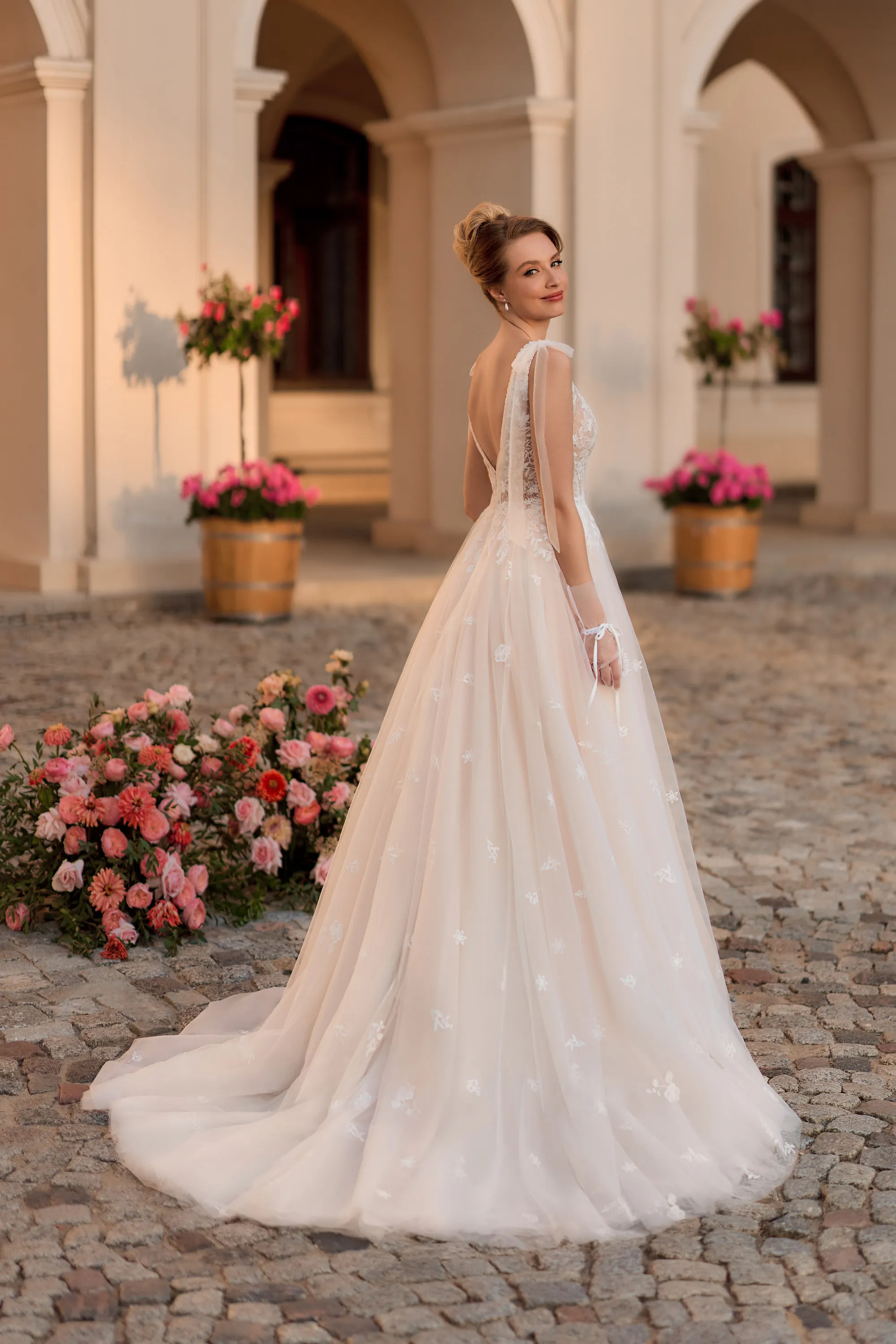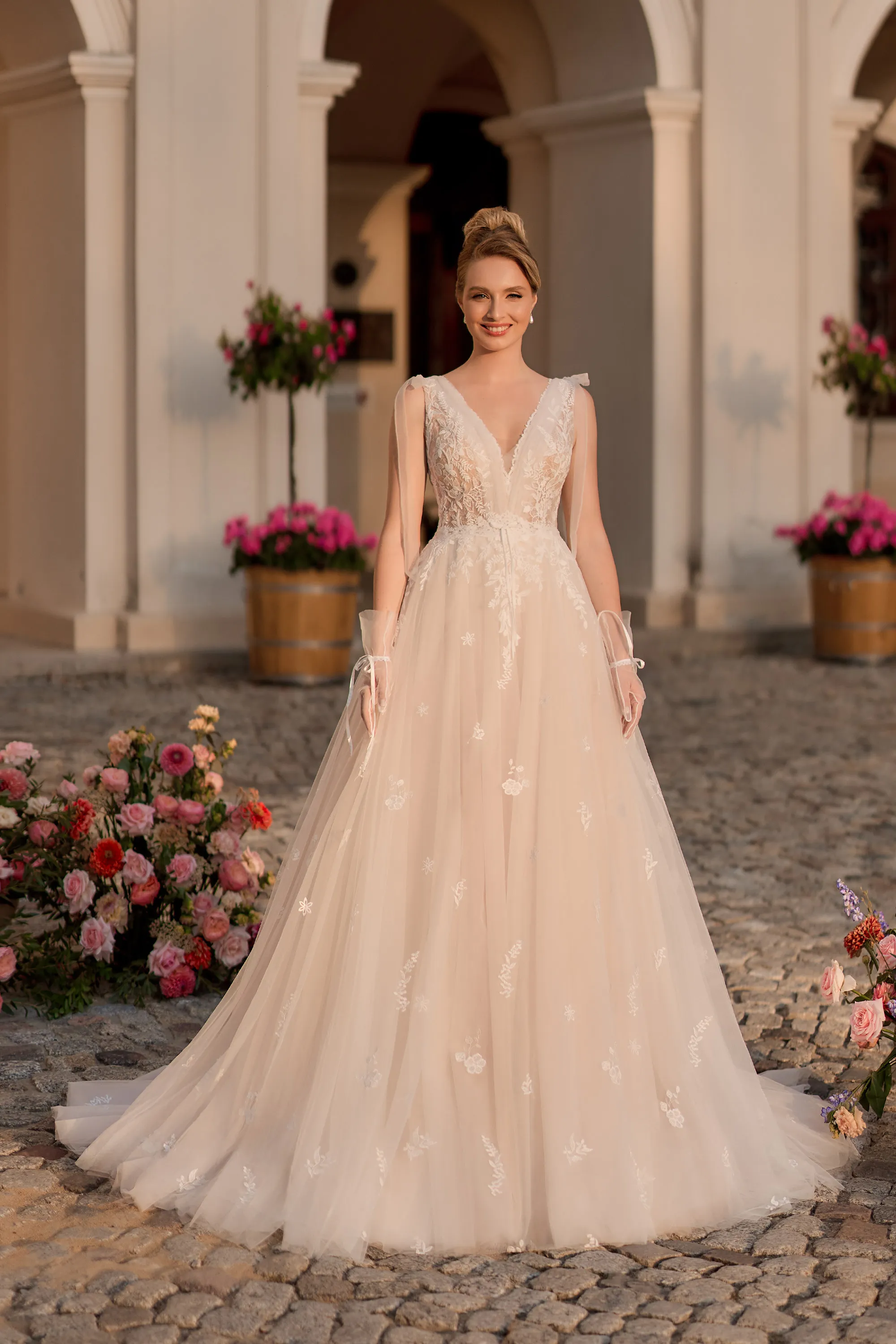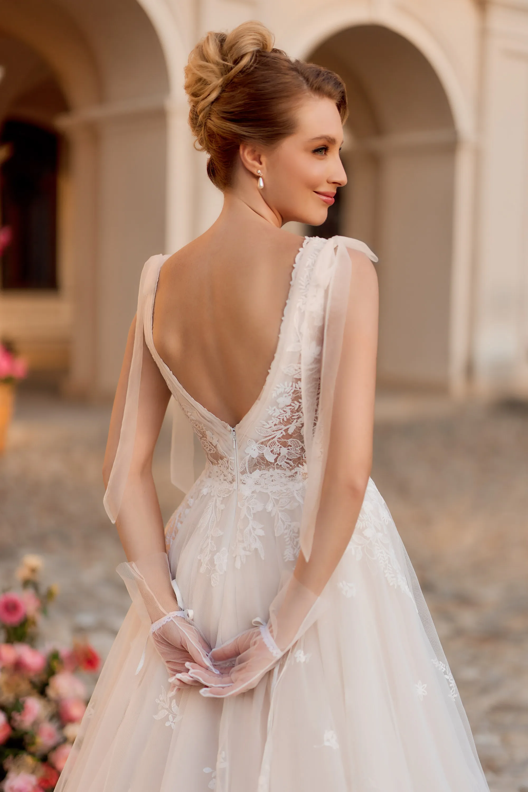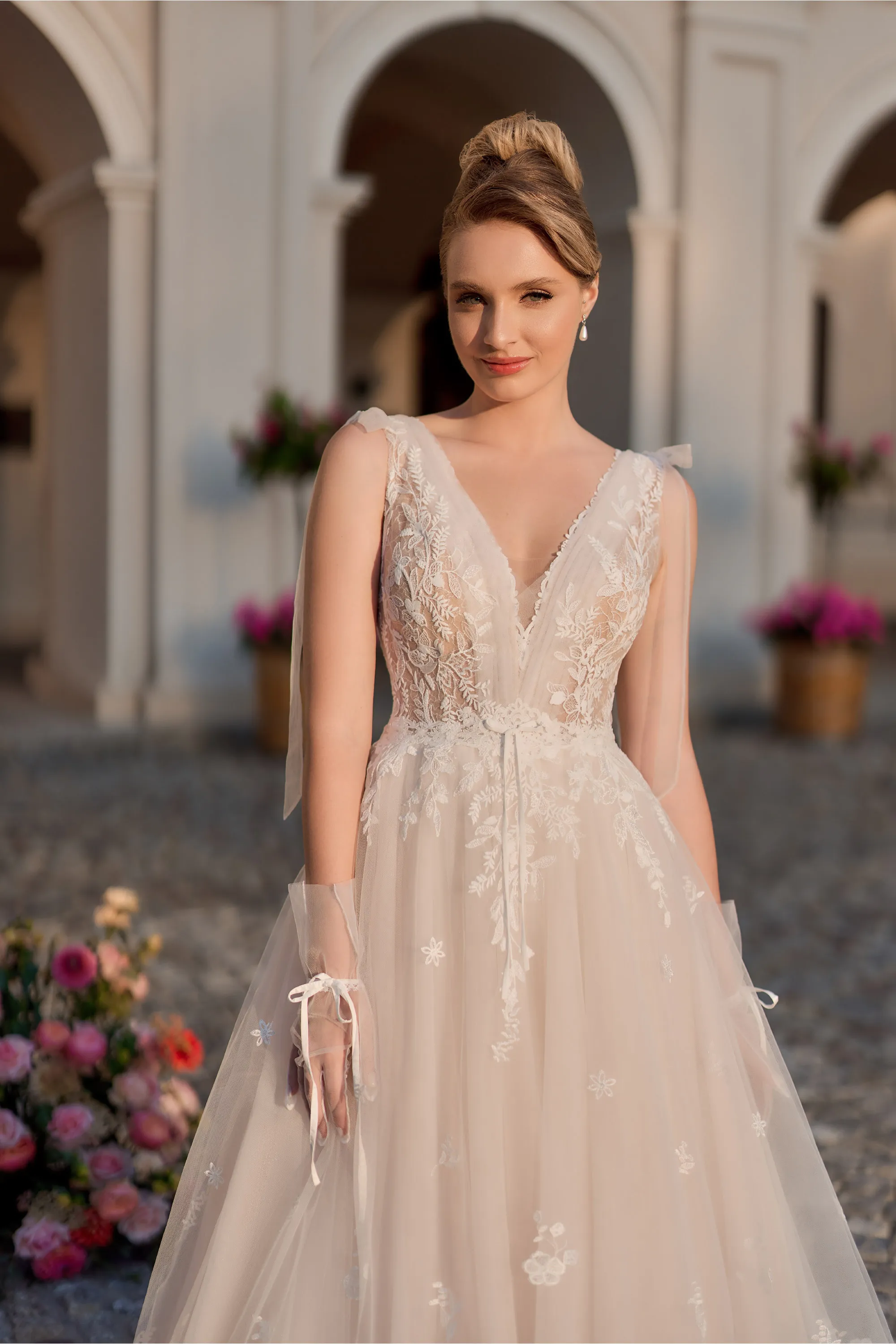 Graceful and refined, this soft A-line gown is made from cappuchino and ivory layers of tulle with floral embroidery cascading through the skirt. The plunging V-neckline is accented with gently draped tulle for a romantic, airy feel, while tied shoulder straps add an ethereal touch. A delicate bow at the waist completes the silhouette, bringing focus to the bodice and adding an element of timeless femininity. The flowing skirt and open back make it a perfect choice for a garden, château, or fairytale wedding.