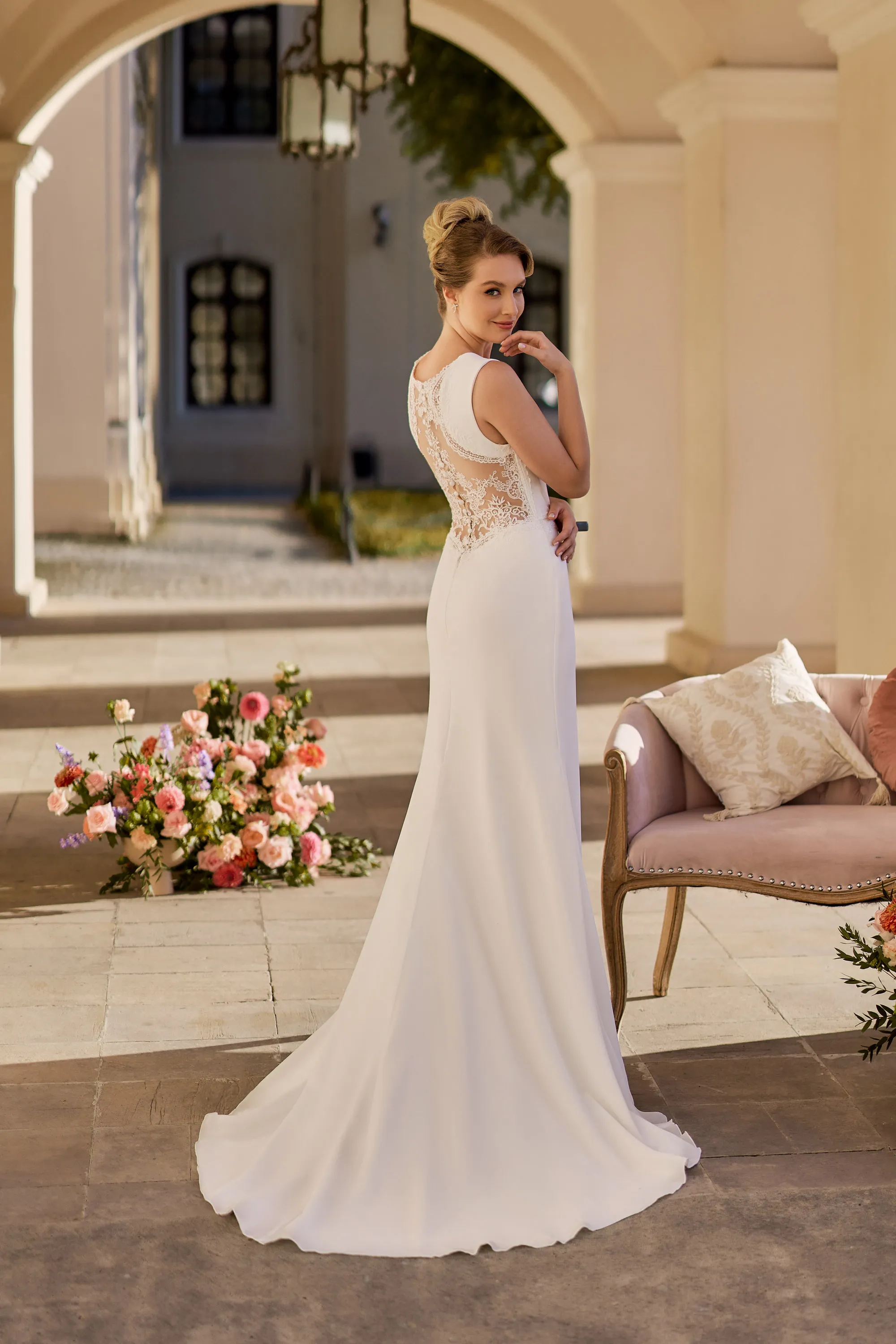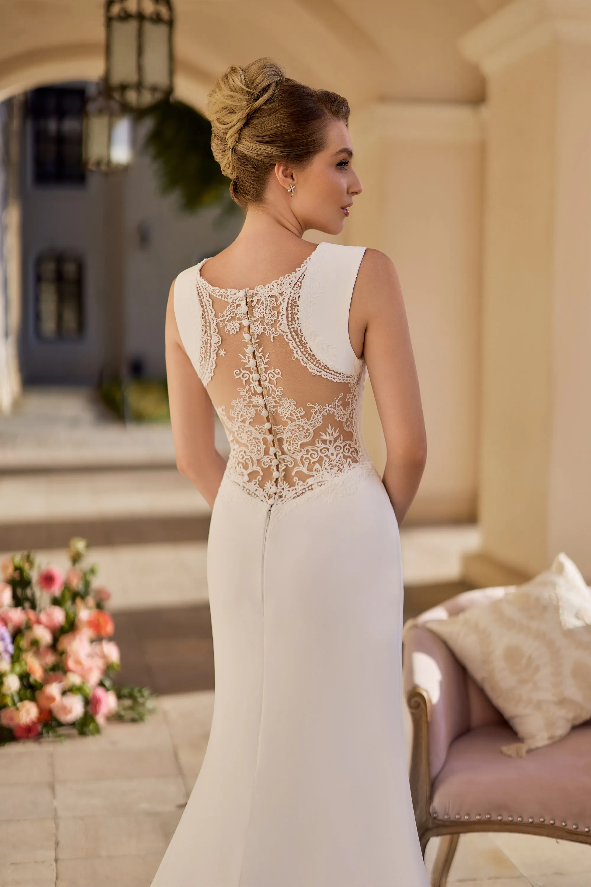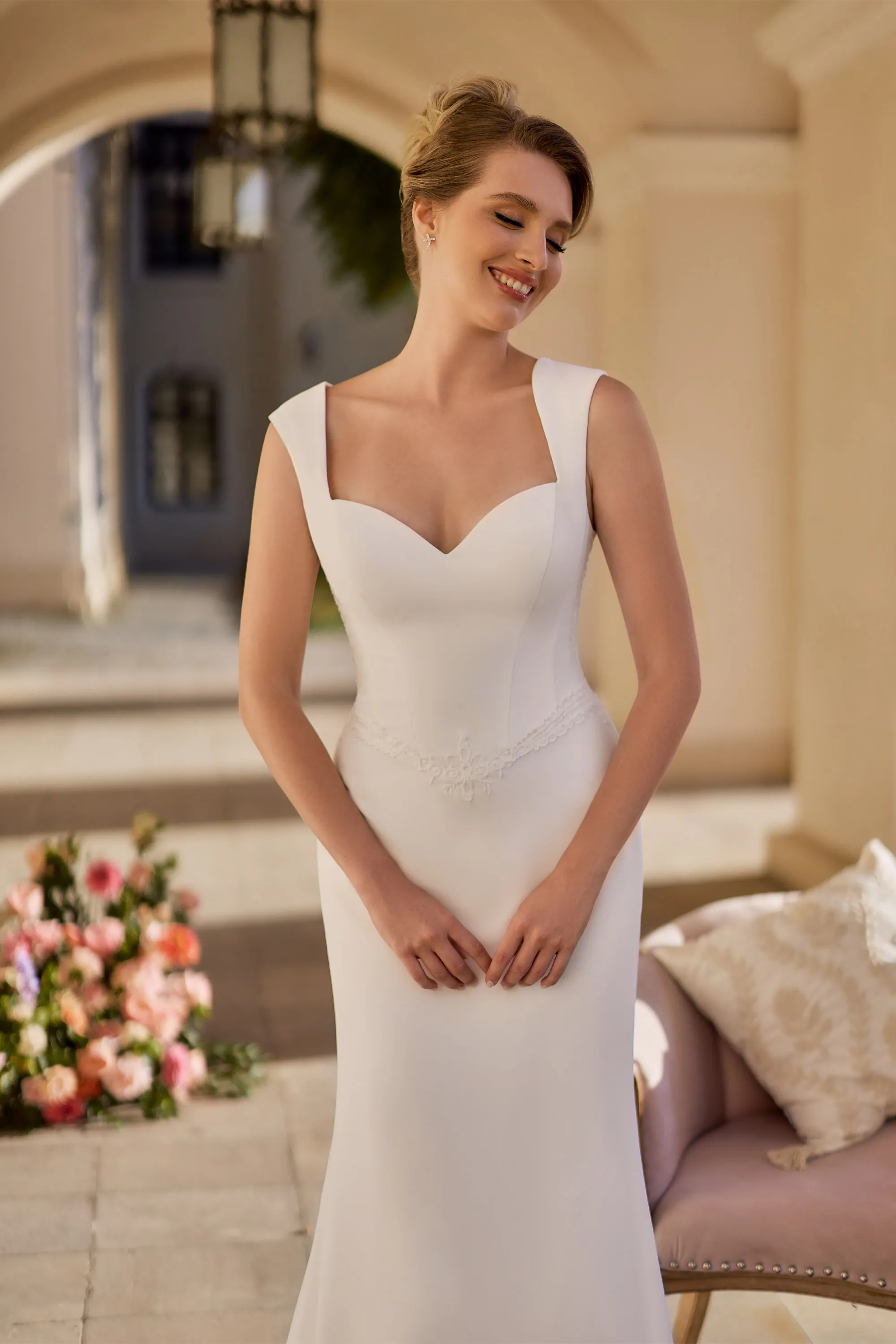 Designed for the bride who appreciates timeless elegance with a modern twist, this fitted wedding gown showcases a queen Anne neckline that flatters the décolletage with graceful structure. The clean crepe silhouette hugs the figure, while lace appliqués at the waist provide soft visual texture and highlight the natural shape. An illusion back adds a whisper of allure, balancing modesty and charm. Perfect for both traditional and contemporary ceremonies, this gown is the definition of understated sophistication.