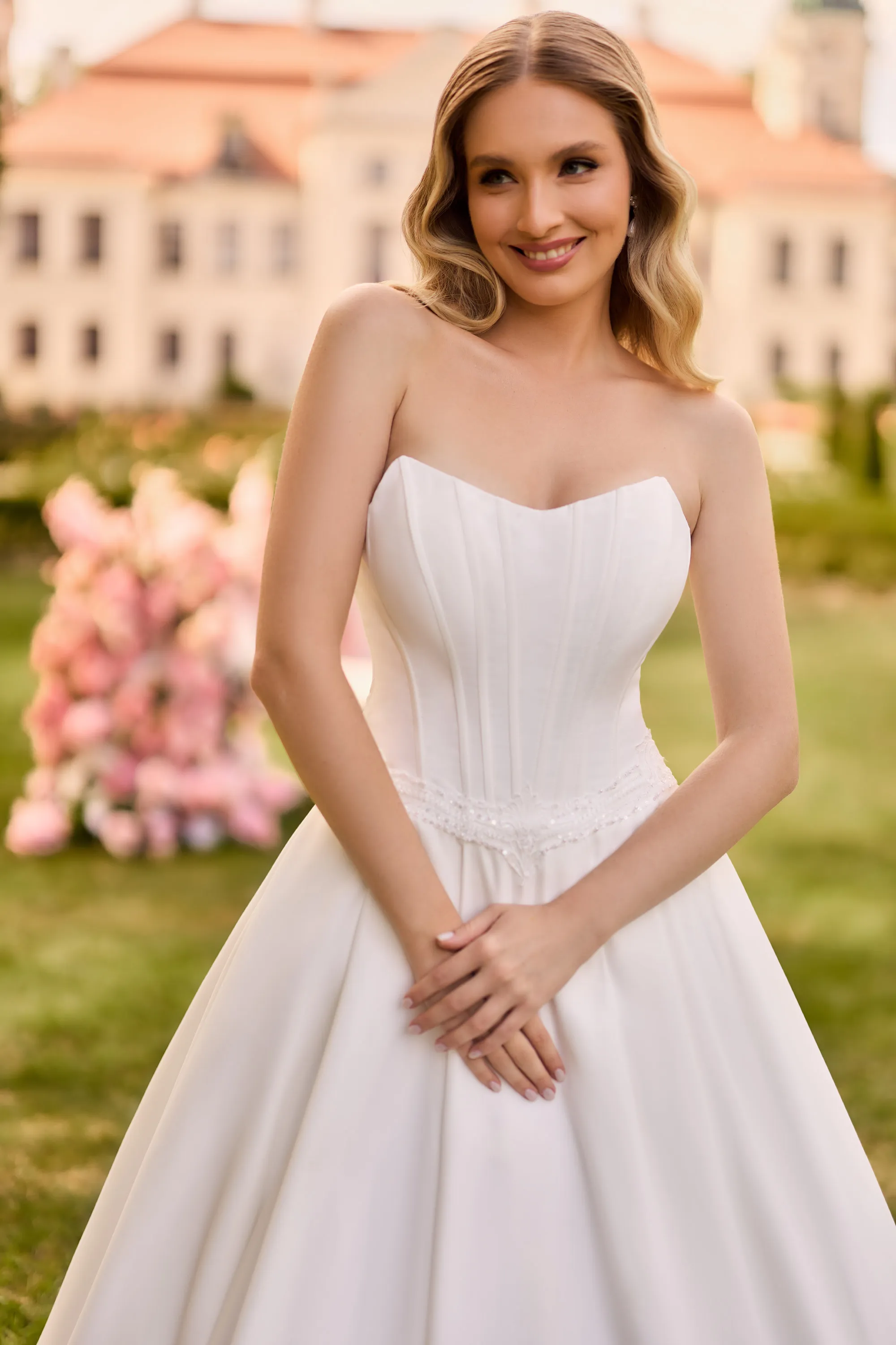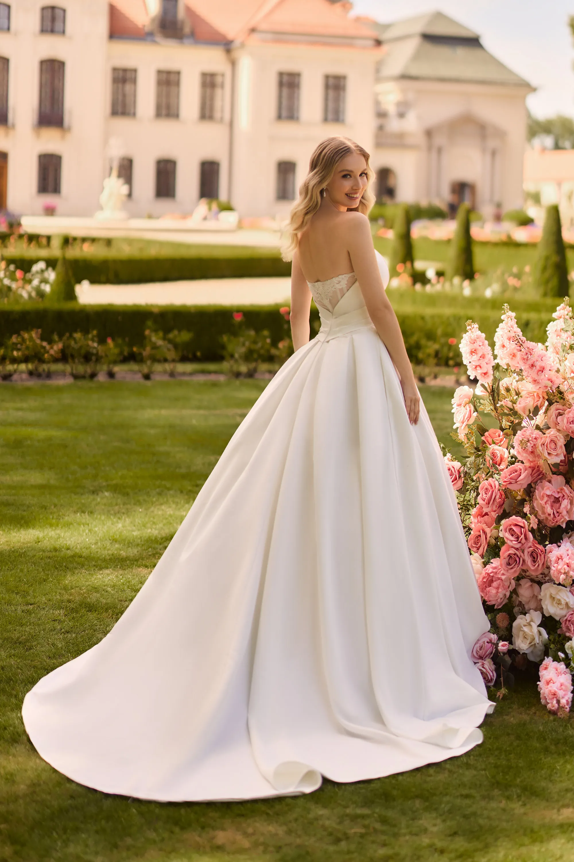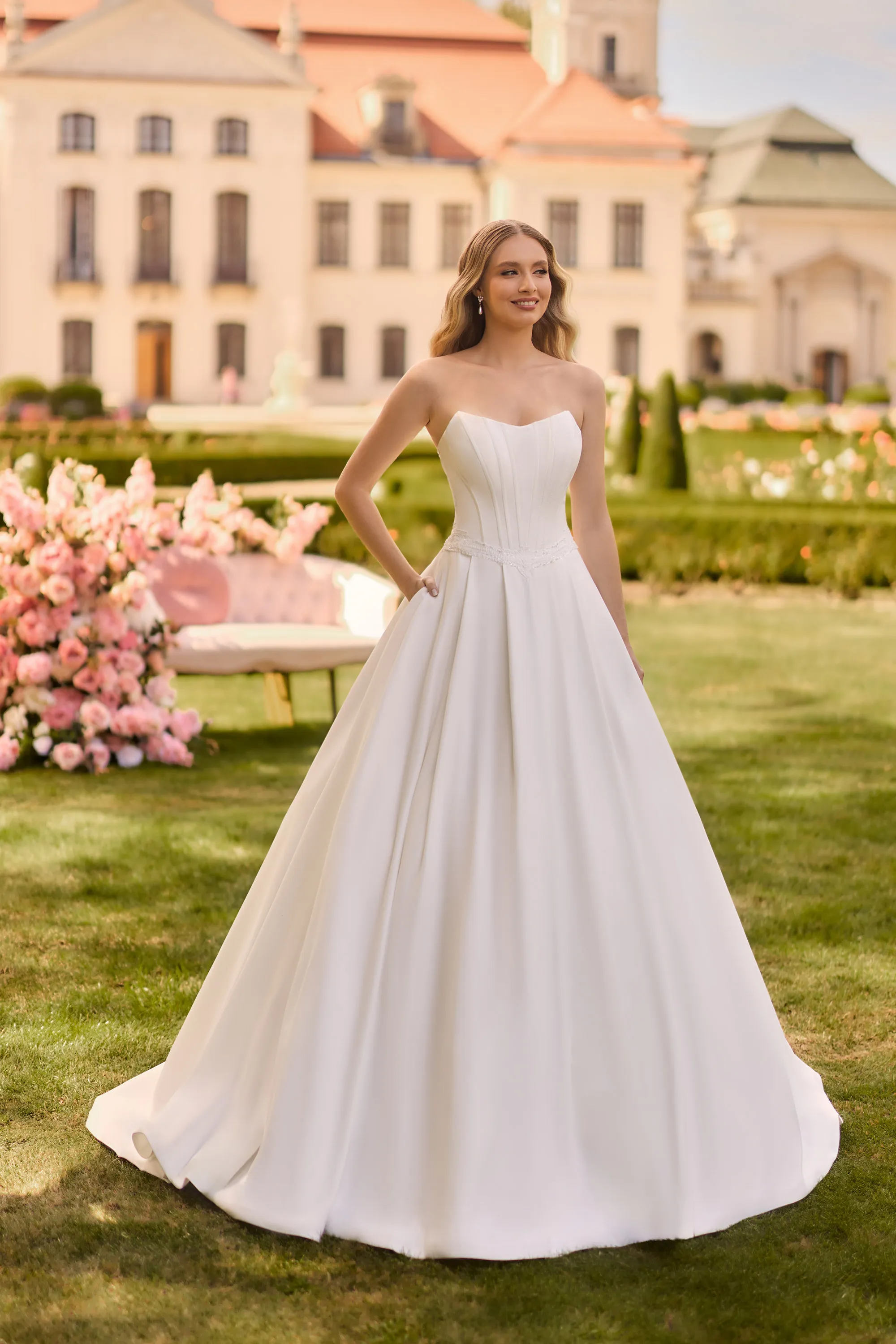 This stunning satin gown combines timeless elegance with a modern twist. The structured bodice features soft scoop neckline and visible boning that enhances the silhouette, while a delicate lace belt subtly highlights the waist. The voluminous ballgown skirt includes hidden pockets for a practical and playful touch. The back stuns with a semi-sheer illusion panel adorned with lace appliqués, creating an eye-catching, graceful finish. A perfect choice for brides dreaming of a clean, yet romantic look.