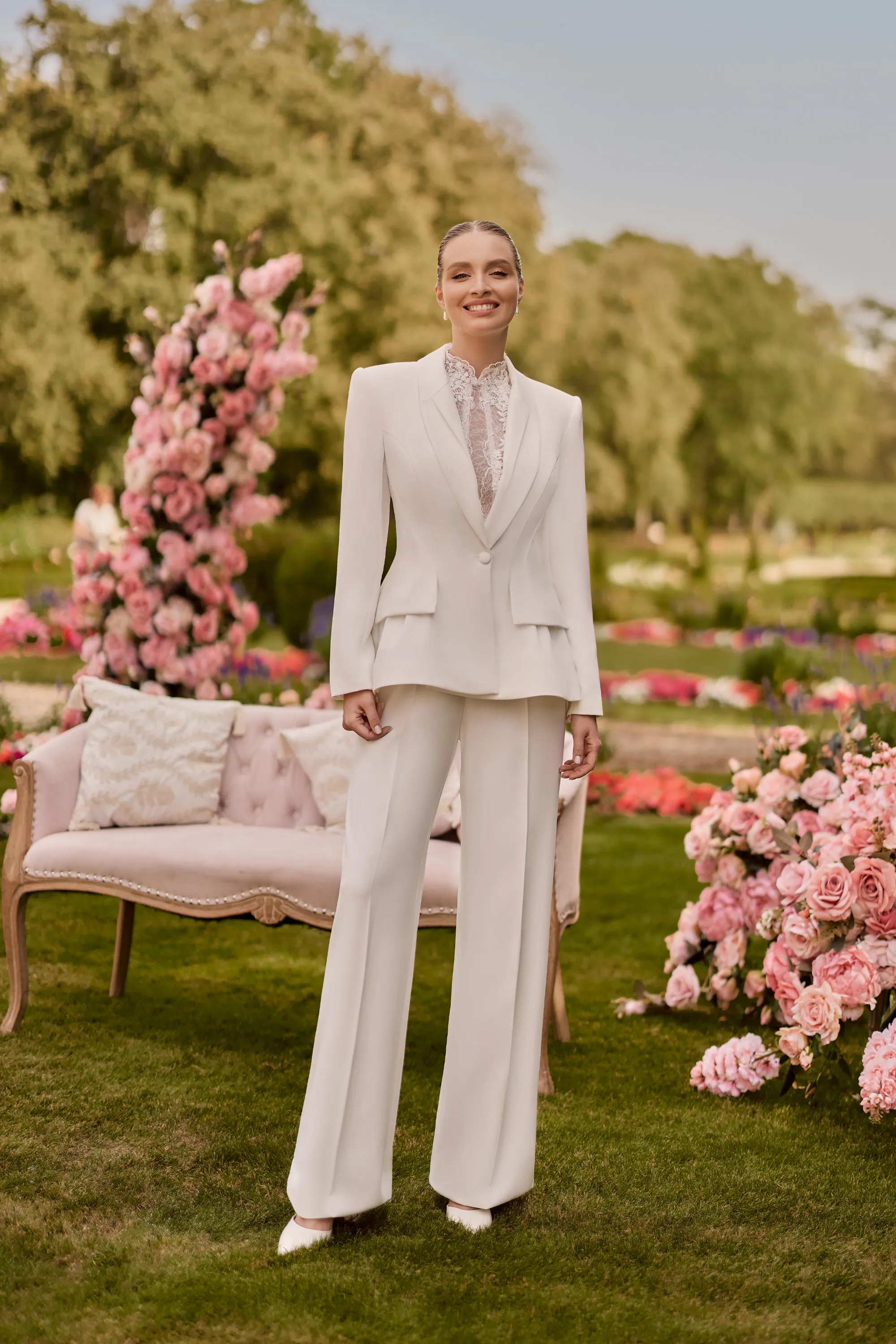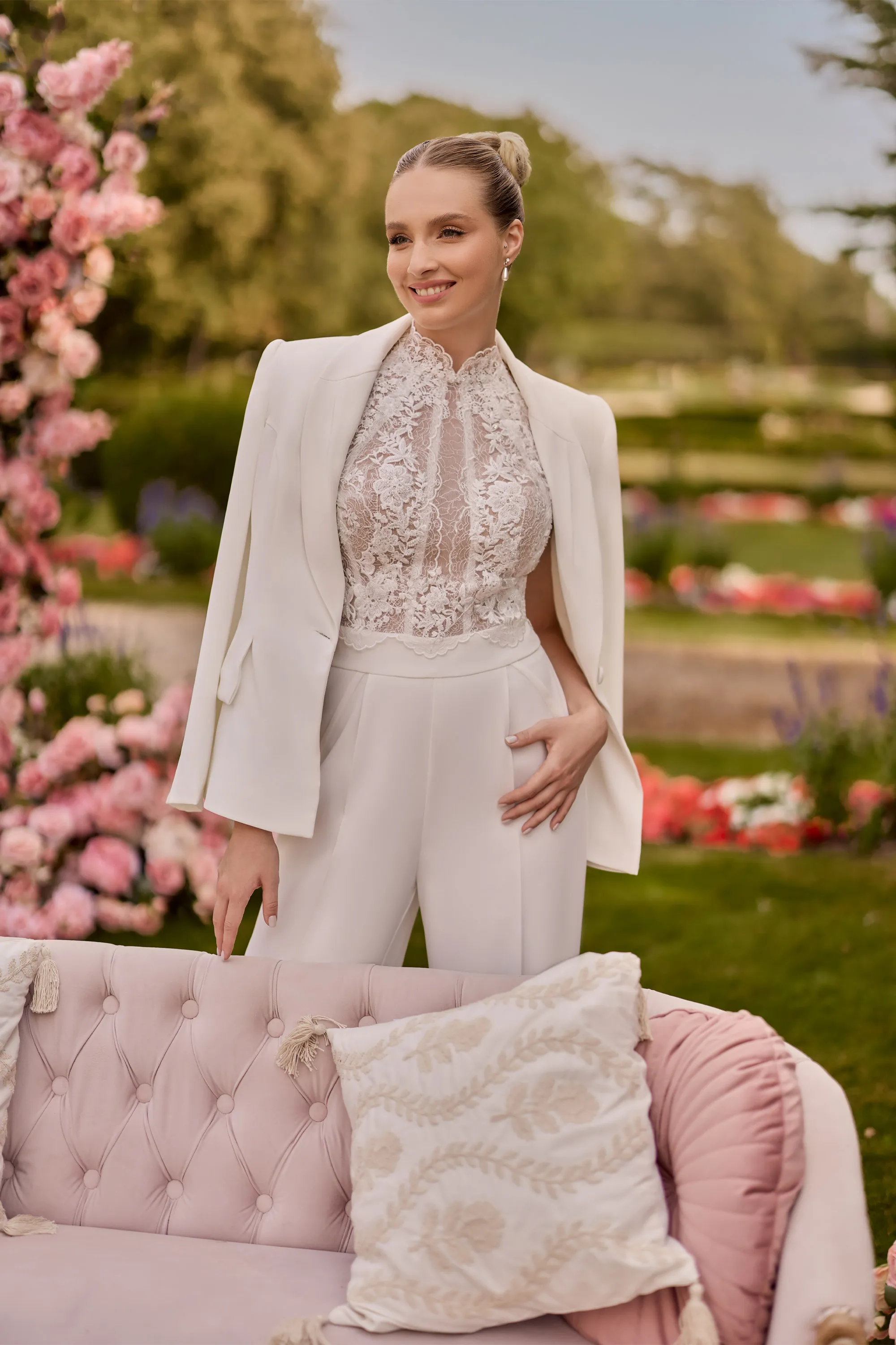 A sleek crepe jacket that brings contemporary elegance to any bridal look. Designed with sharp tailoring. It adds polish and sophistication to bridal jumpsuits or dresses. Pairs beautifully with its matching jumpsute 1190.